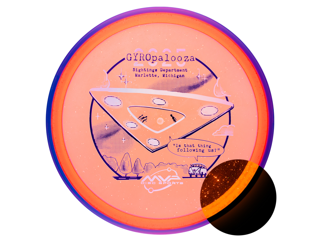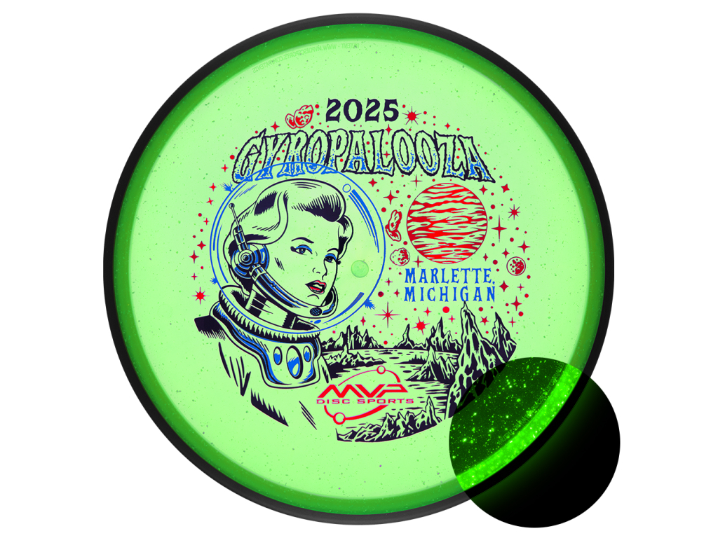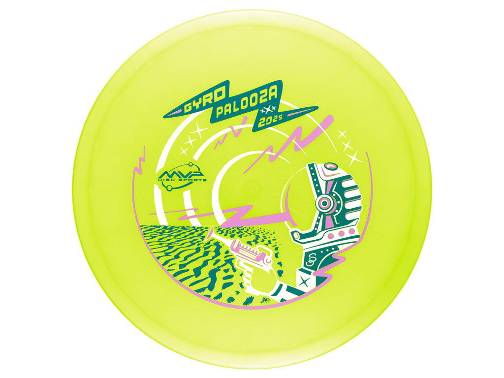 First up is a blast from the past making its exclusive, limited-time return just for GYROpalooza - the Particle Glow Proton Particle! An overstable putter, the Out-of-Production Particle was designed for long, straight flights before the 2.5 fade kicks in to drop right where you want it. Of course, a classic like the Particle deserves a classic stamp to go with the beautiful Particle Glow Proton plastic, which is masterfully brought to us by Brent Schoonover. Returning a retired mold, even temporarily, is an extremely rare thing for MVP. This is your best chance to see what this cult classic was all about!
